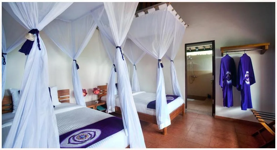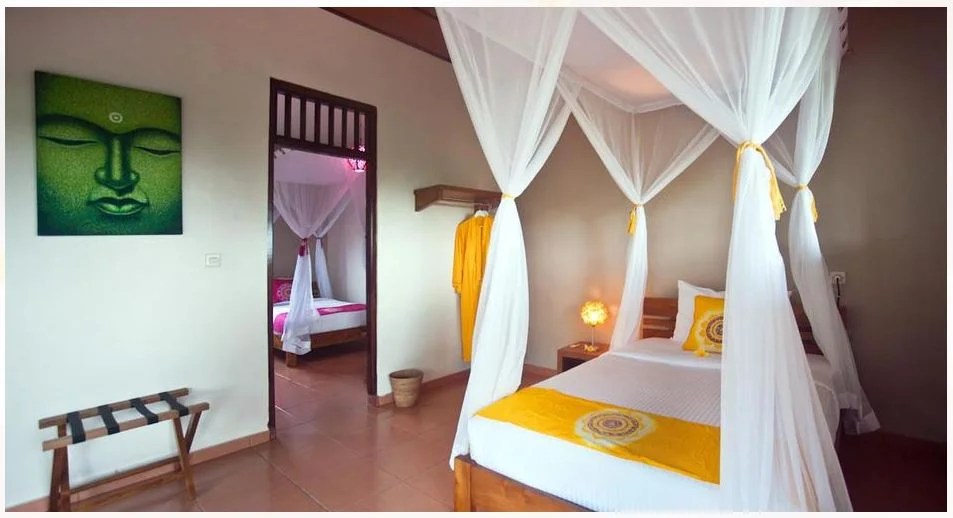 Nestled within an emerald sea of rice paddies just 7 minutes from the center of Ubud, Rainbow Villas consist of 5 newly renovated villas, each with its own verandah and private garden with fishpond. Rice paddy walks extend in every direction from the front door of your Rainbow Villa and the sunsets are beyond compare. Each of our 8 Chakra-themed bedrooms comes not only with its own story and color theme, but with en suite bathrooms, twin beds in the bedrooms for single or double occupancy, fans, optional portable air conditioning, rice paddy and sunset views, and open access to the retreat center’s luxurious amenities (just a 2-minute stroll from your villa).